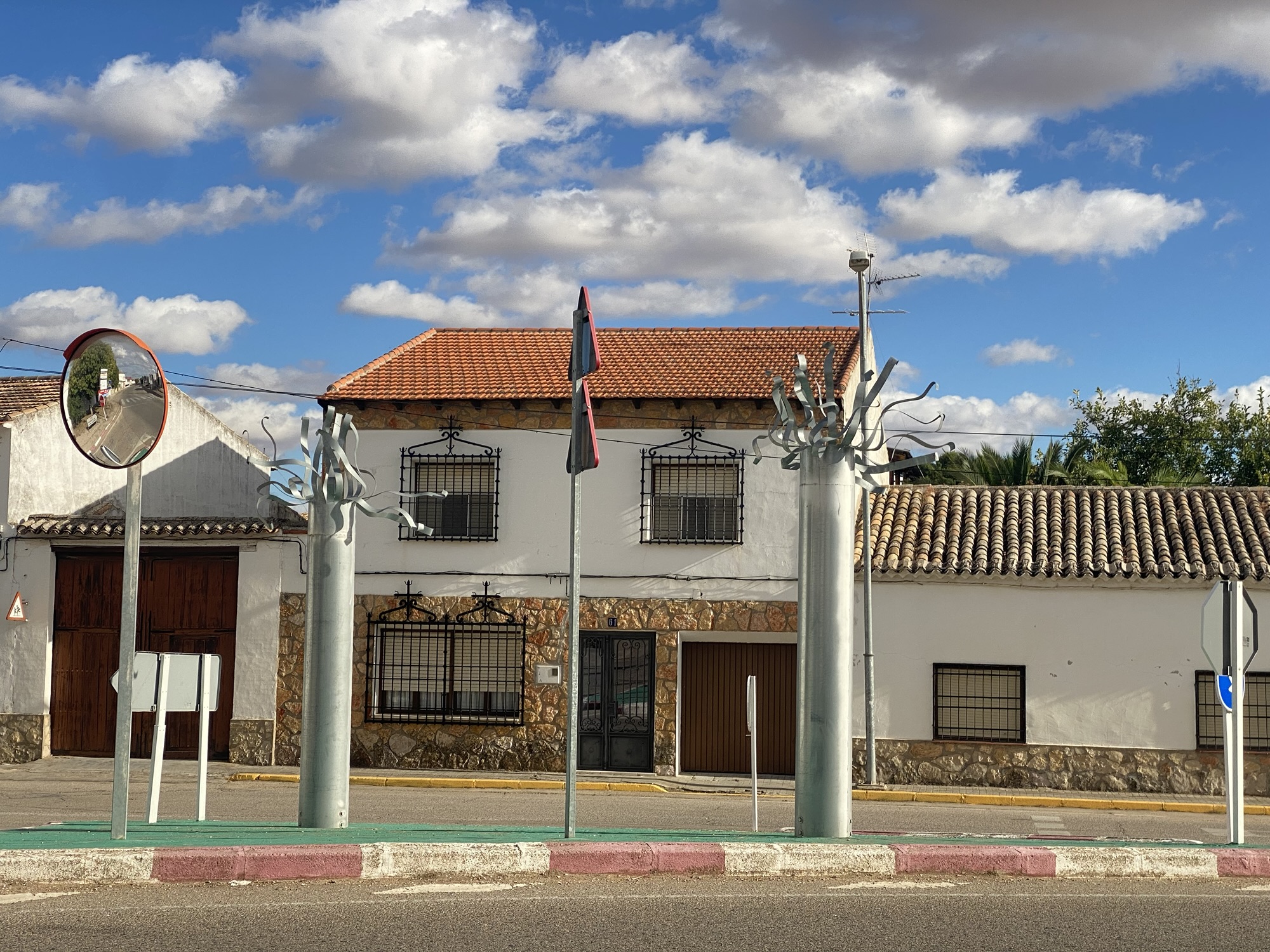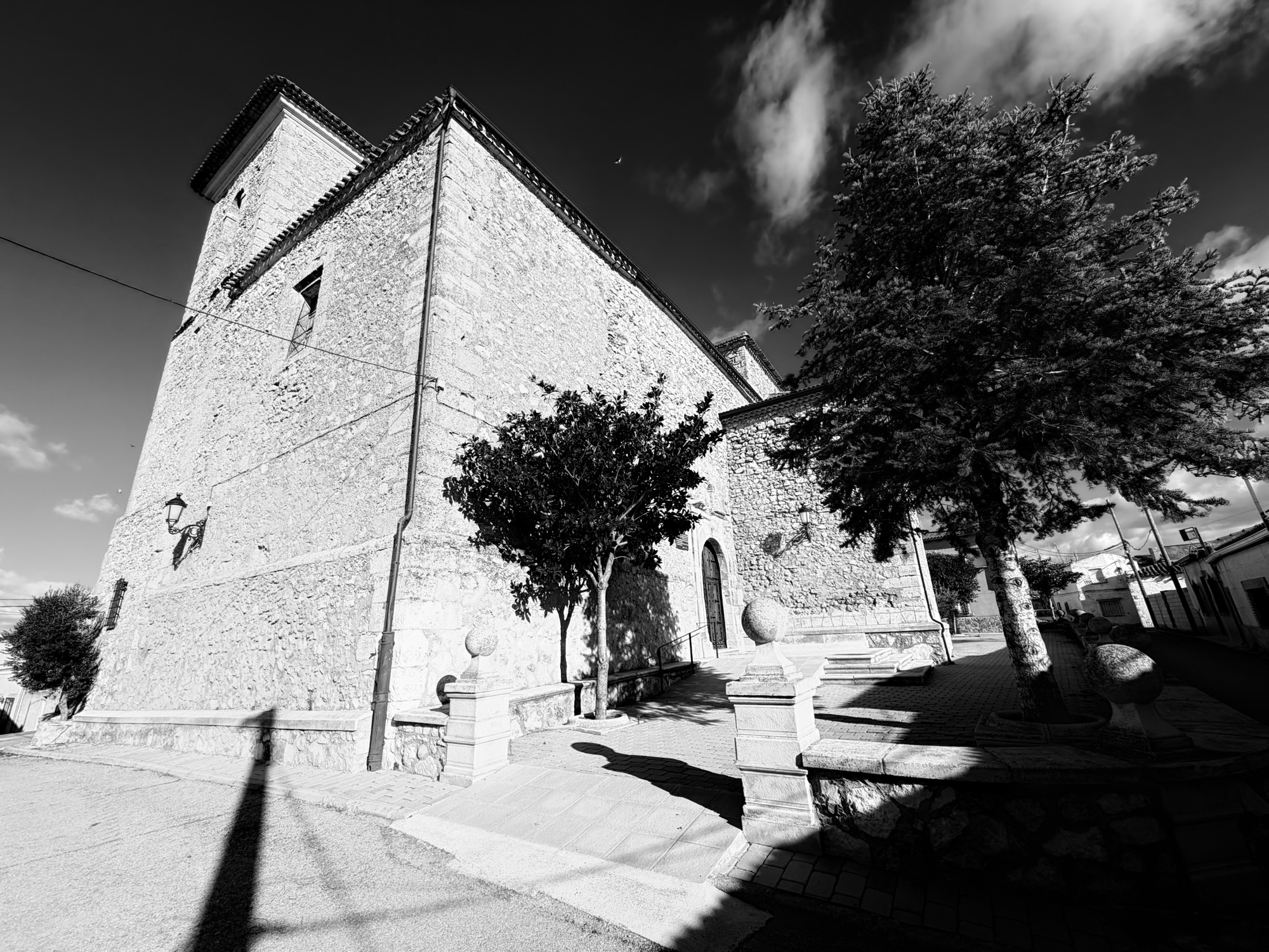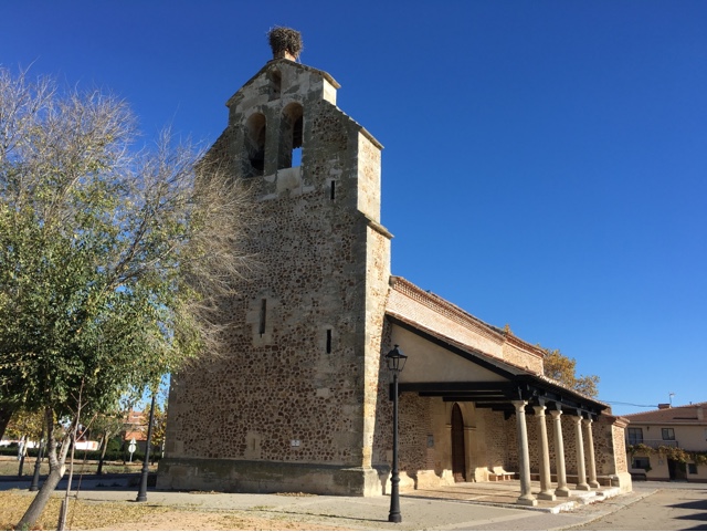 Destaca su maciza espadaña de tres arcos.